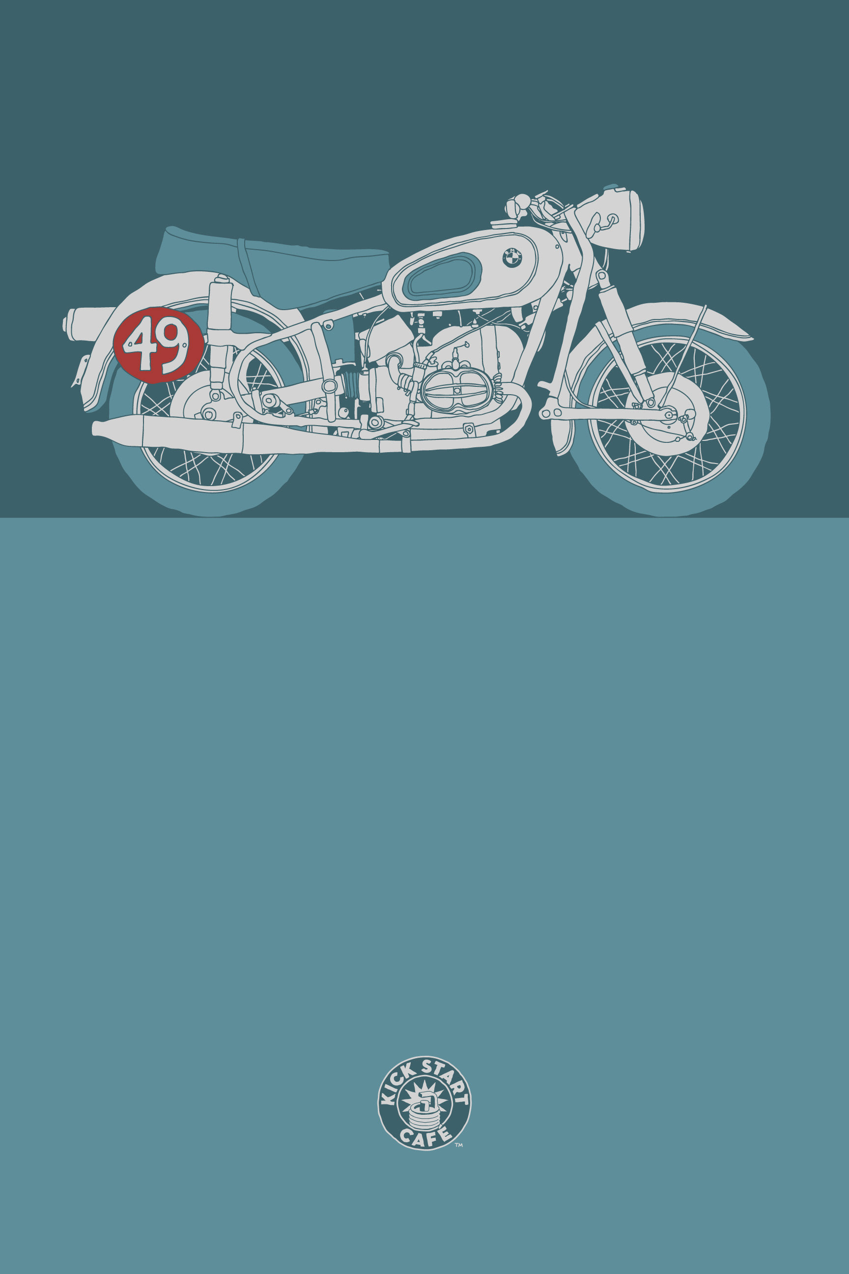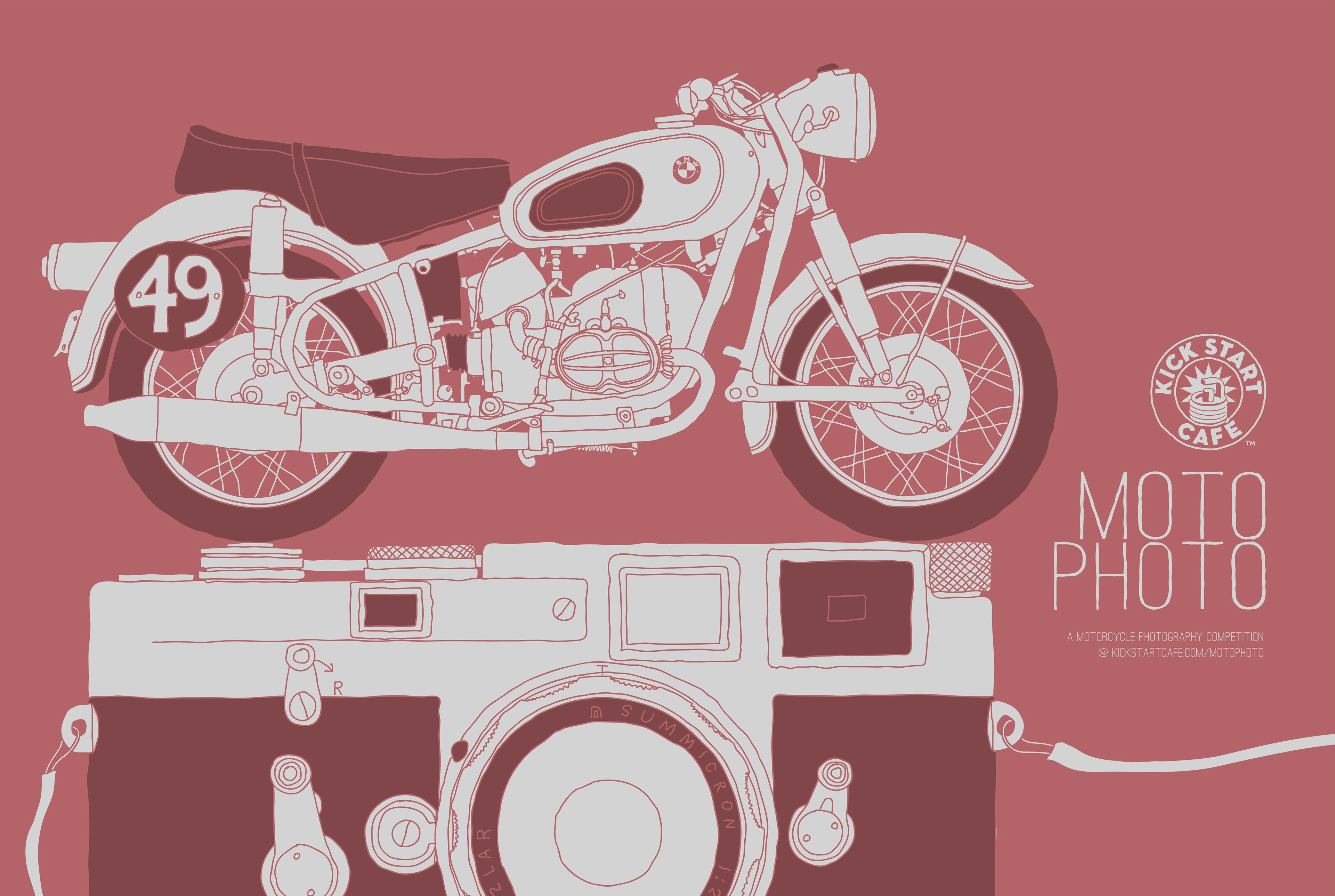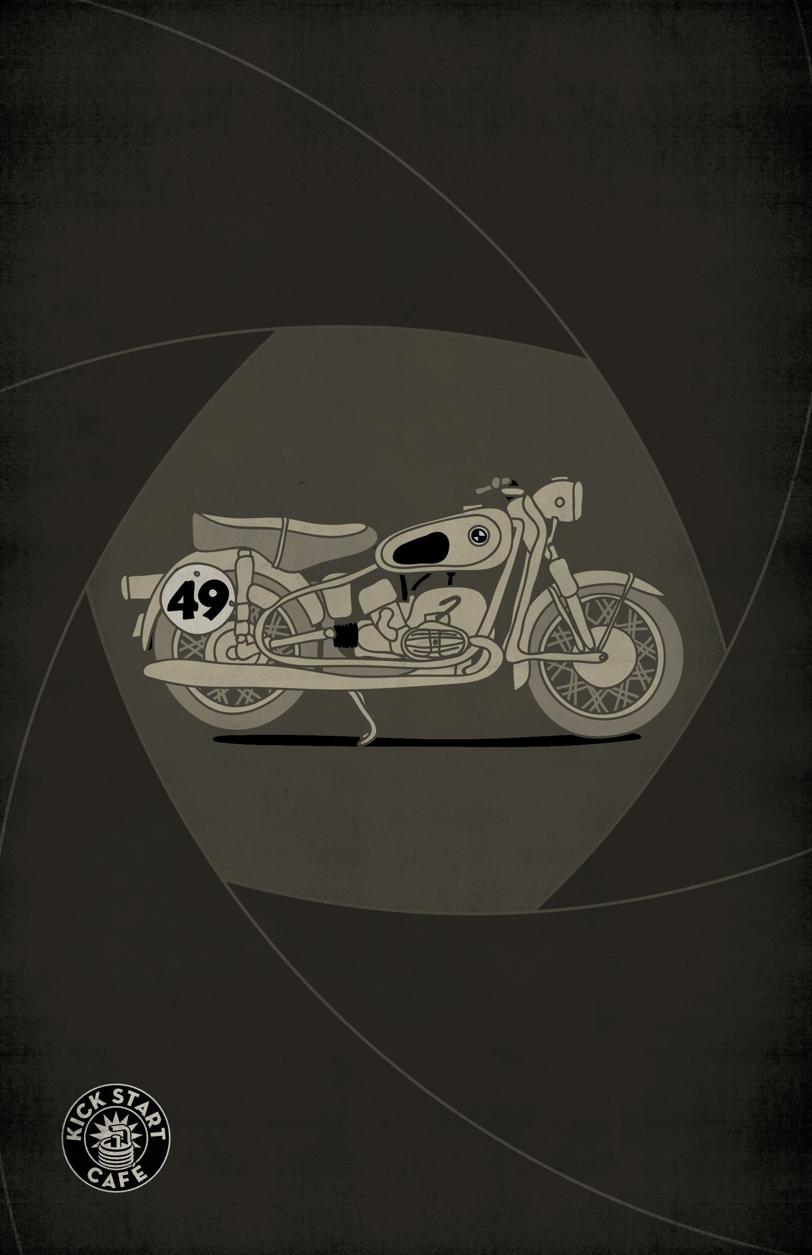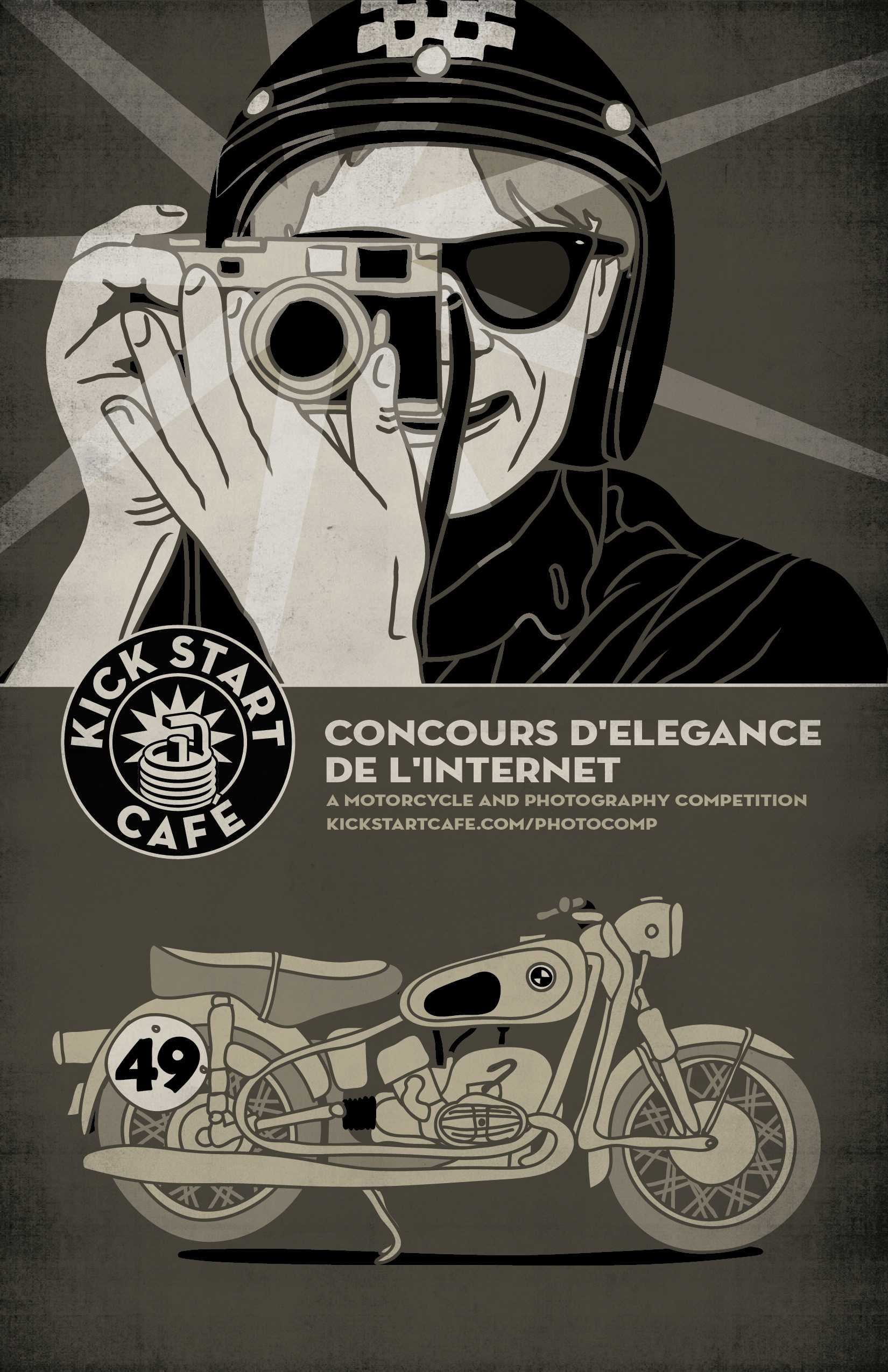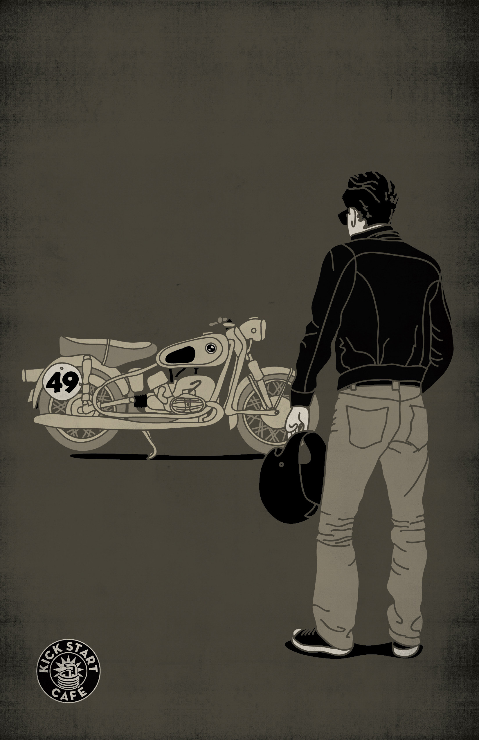 Various illustrations for Kick Start Café used as artwork in the Coffee Bar and as advertising for the Concours D'Elegance De L'Internet - a motorcycle and photography competition.